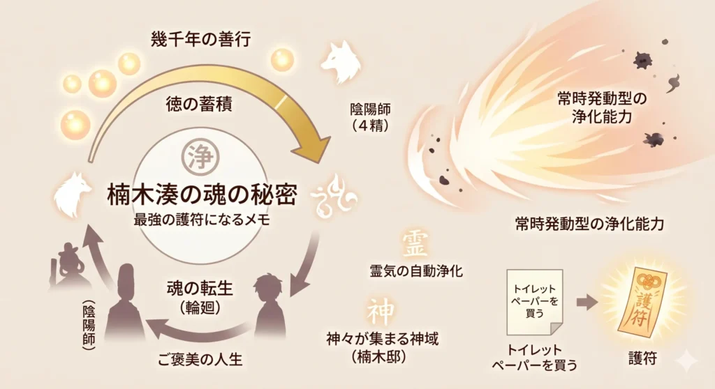 山神の視点から語られた真実によれば、湊の魂は数千年にわたって何度も転生を繰り返しており、その全ての人生において「善行」を積み重ねてきたというのです。これまでの過酷な転生の中には、陰陽師として生きた過去世も存在しており、今世で彼が術を易々と再現できるのは、魂に刻まれた膨大な経験と技術の賜物なんですね。さらに驚くべきは、湊の今世は「これまで頑張ってきたことに対するご褒美の人生」として天から設定されていたという点です。本来なら何もせずに穏やかに過ごすはずだった魂ですが、そのあまりの清浄さに惹かれた神々が集まってしまったため、結果として「賑やかなご褒美」になってしまいました。この「魂の完成度」こそが、彼の無敵の浄化力の正体というわけです。