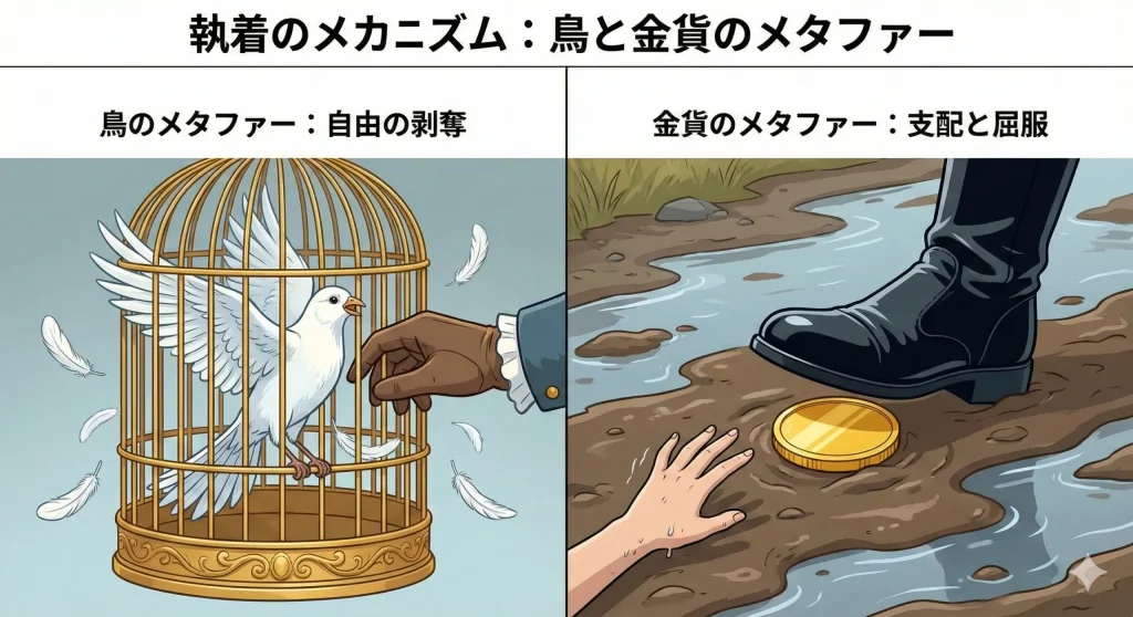また、レイラの象徴である「鳥」に対しても、マティアスは加害的な態度をとります。彼女が愛でる鳥を目の前で狩り、自由を奪うことで、彼女の関心をすべて自分に向けさせようとするんです。マティアスの愛は初期段階において、相手の羽根を一枚ずつむしり取り、豪華な籠に閉じ込めるようなサディスティックな性質を持っていました。対するレイラは、彼を憎み、恐れ、必死に逃げようとします。彼女にとってマティアスは、自分の平穏を壊す嵐のような存在でした。この「逃げる獲物」と「追う猟師」の緊張感が、物語中盤までの大きな推進力となっています。マティアスがレイラの眼鏡を隠したり、執拗に視線を送ったりする細かな執着描写の一つひとつが、後の破滅的な後悔へと繋がっていく伏線になっているのが、この作品の本当に巧みなところだと感じます。