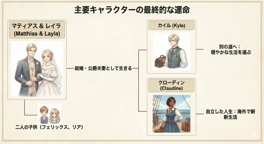 最終的に、カイルはレイラを救い出すことができず、彼女がマティアスの手に落ちるのをただ見送るしかありませんでした。物語の結末において、カイルはレイラへの想いを胸に秘めたまま、別の道を歩むことになります。彼が迎えた結末は、決して不幸ではありませんが、レイラと共に歩むはずだった未来が永久に失われたという意味で、非常に切ないものとなっています。カイルはマティアスのような毒を持たなかったからこそ、レイラを幸せにする資格があったはずなのに、その優しさが仇となってしまった。読者の間でも「カイルが報われてほしかった」という声が多いのは、彼がこのドロドロとした物語の中で唯一、真っ当な人間愛を持っていたからこそでしょうね。
