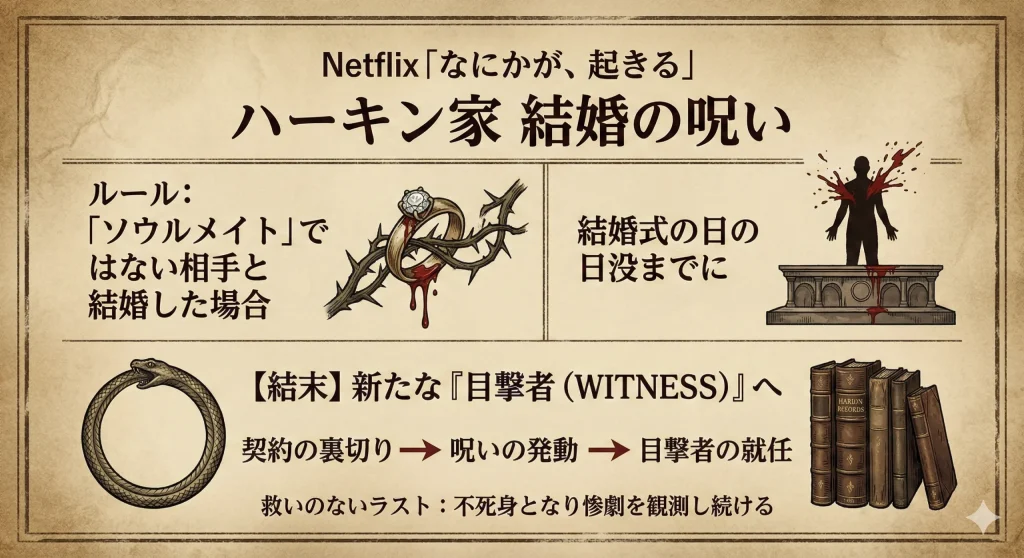 本作において最も重要かつ恐ろしい設定が、ハーキン家に伝わる「結婚の呪い」の詳細なルールです。その内容は、「運命の相手(ソウルメイト)」ではない相手と結婚した場合、結婚式の日の日没までに全身の穴という穴から出血して死亡するというもの。この呪いの厄介な点は、たとえ本人が相手を愛していると信じ込んでいても、深層心理にわずかでも「この人で本当にいいのか?」という疑念があれば、それはソウルメイトではないと判定されてしまう点にあります。人間の感情という曖昧なものを、死という絶対的な結果で裁くという設定が、物語に緊張感を与えていますね。