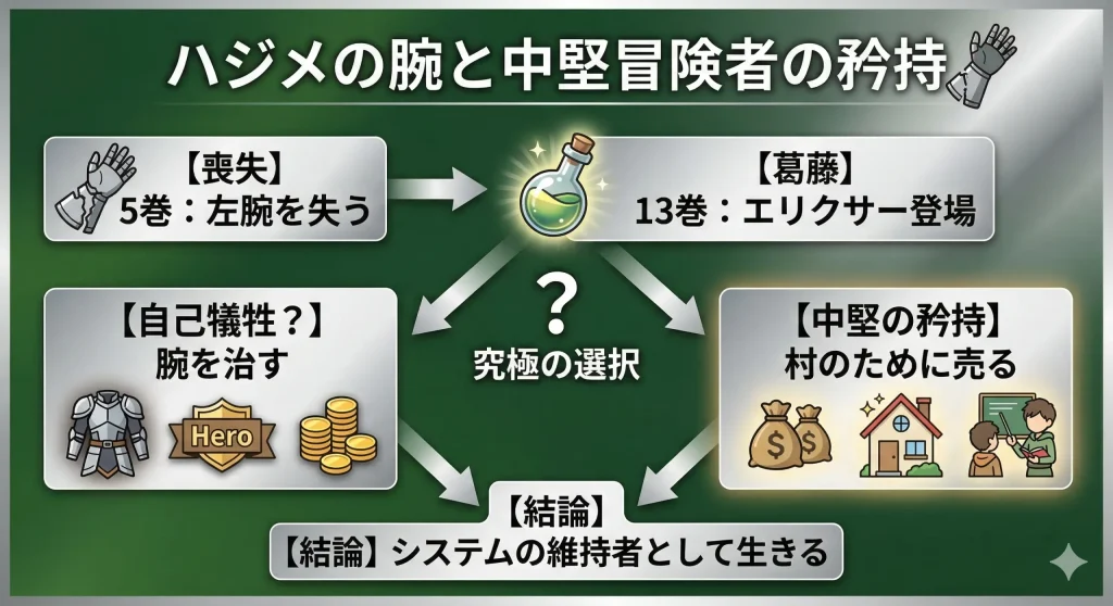 物語の中盤、13巻でついに伝説の回復薬「エリクサー」が登場します。どんな怪我も治すとされるこの薬は、ハジメの失った腕を再生させるための唯一の希望となります。しかし、ここで作者の港瀬つかさ先生は、読者に安易なカタルシスを与えません。エリクサーはとんでもなく高価なものであり、それを自分の腕のために使うか、あるいは莫大な金銭に変えて村や仲間のために役立てるかという、現実的な選択肢をハジメに提示します。