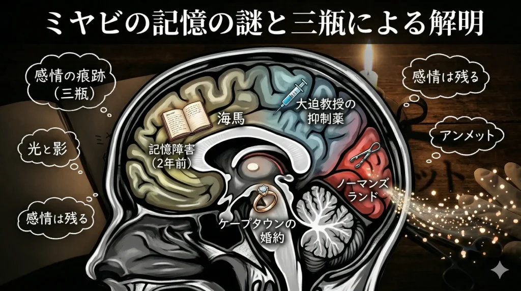 日本で再会したとき、ミヤビちゃんにとって三瓶先生は「初対面の少し怖い先生」でしかありませんでした。愛する人の瞳の中に、自分の存在が1ミリも残っていないという現実。三瓶先生が時折、遠くを見つめるような寂しげな表情を見せていたのは、自分だけが覚えている愛の記憶と、目の前の「他人」として振る舞うミヤビちゃんとのギャップに耐えていたからなんですよね。でも、彼は自分が婚約者であることを名乗って彼女を混乱させることはしませんでした。まずは彼女を「医師」として再生させること、それが彼なりの愛の形だったのかなと思います。