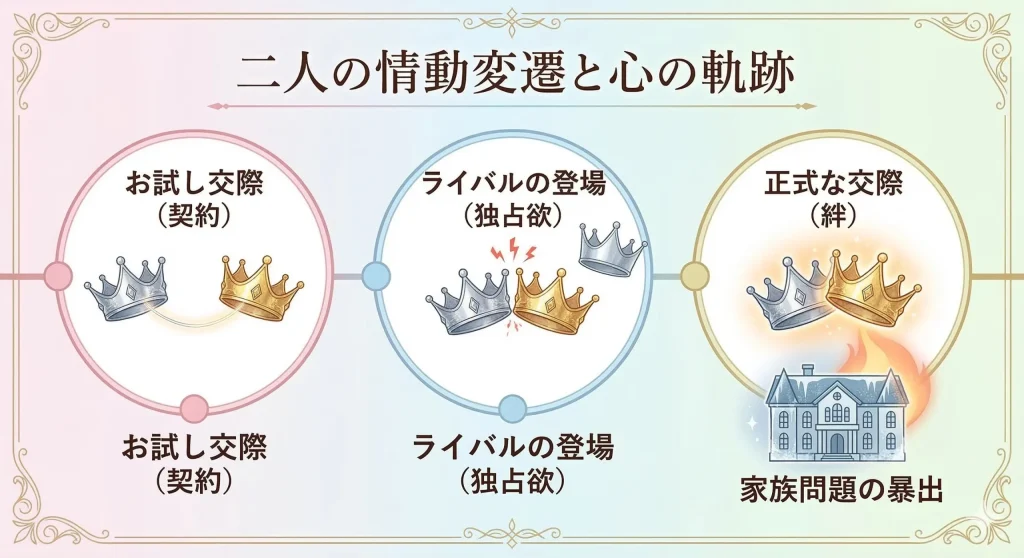 | 中期(3-5巻) | ライバル登場・本告白 | 自尊心の芽生え | 独占欲の爆発 |