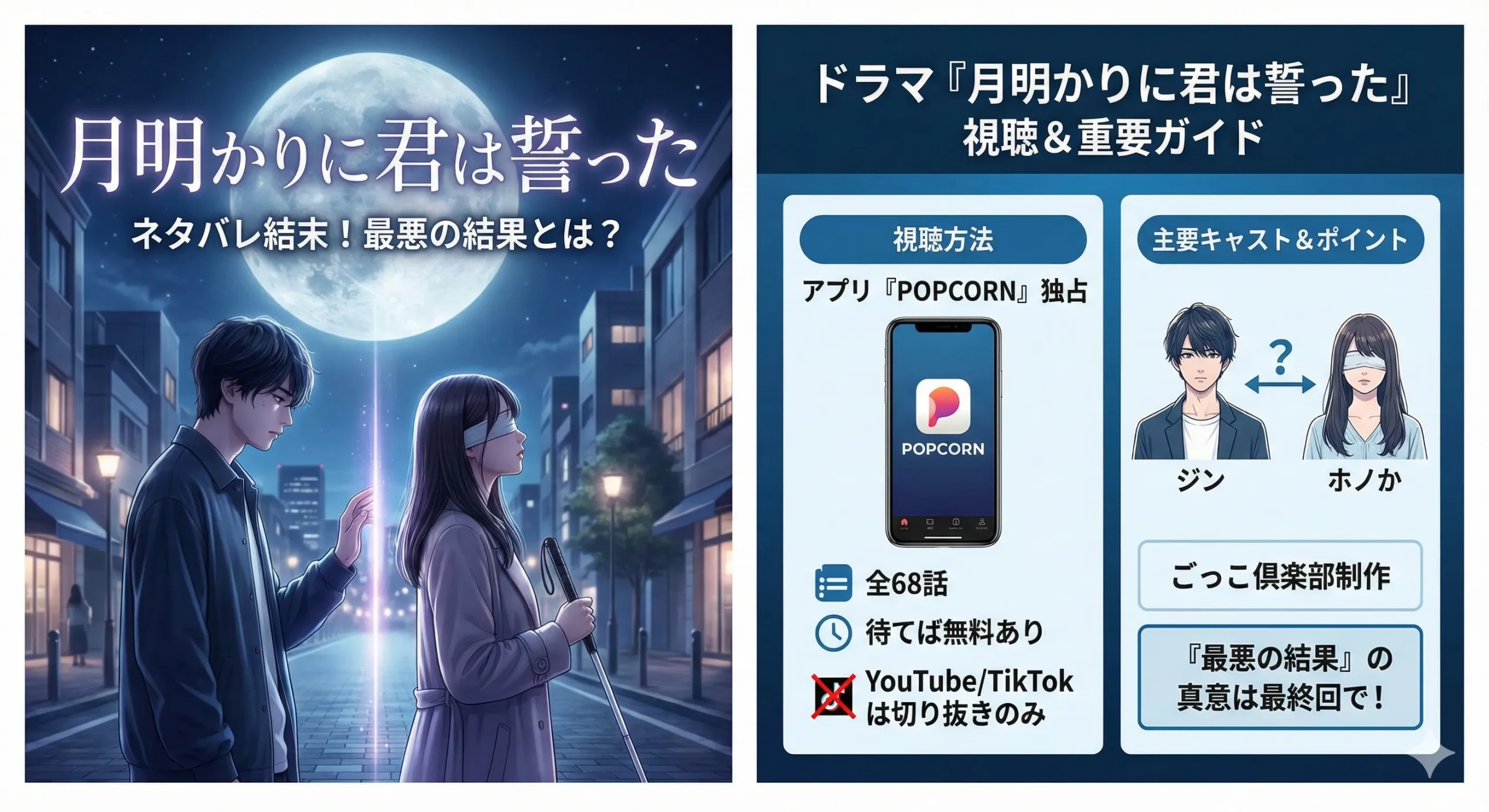 最近、SNSの広告やYouTubeのショート動画で流れてくる「月明かりに君は誓った」というドラマ、一度見始めると止まらなくなりますよね。特に、切ない表情を浮かべる盲目のヒロインと、彼女を必死に探している主人公の姿を目にすると、どうしてもその後の展開が気になって、月明かりに君は誓ったのネタバレを求めて検索してしまう気持ち、本当によく分かります。ネット上には、悪魔社長や契約結婚といった別の作品とタイトルが混ざってしまっている情報も多いですが、この作品はごっこ倶楽部が制作する全く新しい縦型ショートドラマなんです。あらすじやキャストの情報を正しく知ることで、ドラマの深みはもっと増しますし、どこで見れるのかといった視聴方法を確認して、最後まで一気に見届けたいという欲求が生まれるのも無理はありません。この記事では、私がリサーチした情報を基に、物語の核心に迫る結末の考察から、気になる豪華キャスト陣の素顔までを詳しくまとめてみました。この記事を読めば、あなたのモヤモヤもスッキリ解消して、より深く作品の世界に没入できるかなと思います。