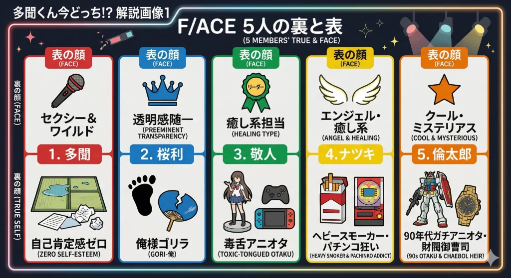 改めて、F/ACEというグループがなぜここまで魅力的なのか、その理由である「裏と表」のギャップを整理してみましょう。彼らは全員が、世間が求める「完璧なアイドル像」と、自分自身の「不完全な本音」の間で揺れ動いています。このギャップこそが、ネタバレを検索してでも知りたくなる中毒性の正体ですね。