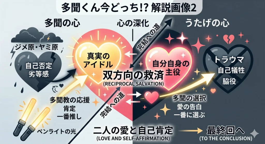 彼女が多聞を「推す」ことで自分の存在価値を見出していたのは、自分を消して誰かの光を支えることこそが、自分が唯一社会で許される居場所だと思い込んでいたからかもしれません。しかし、多聞がうたげを「一人の女性」として、そして「一番大切な存在」として選び取ろうとすることで、このトラウマは崩壊し始めます。推しに救われるファン、という構図から、一人の人間が別の人間によって救われる、という本質的な人間愛への昇華。この「徳を積む」という言葉の裏に隠されたうたげの孤独が癒やされる過程こそが、今後の物語の最重要テーマになることは間違いありません。推し活の倫理観を問い直しつつ、それでもなお「人を推すことの救い」を肯定する本作のスタンスは、現代を生きる多くのファンの心に深く刺さるはずです。