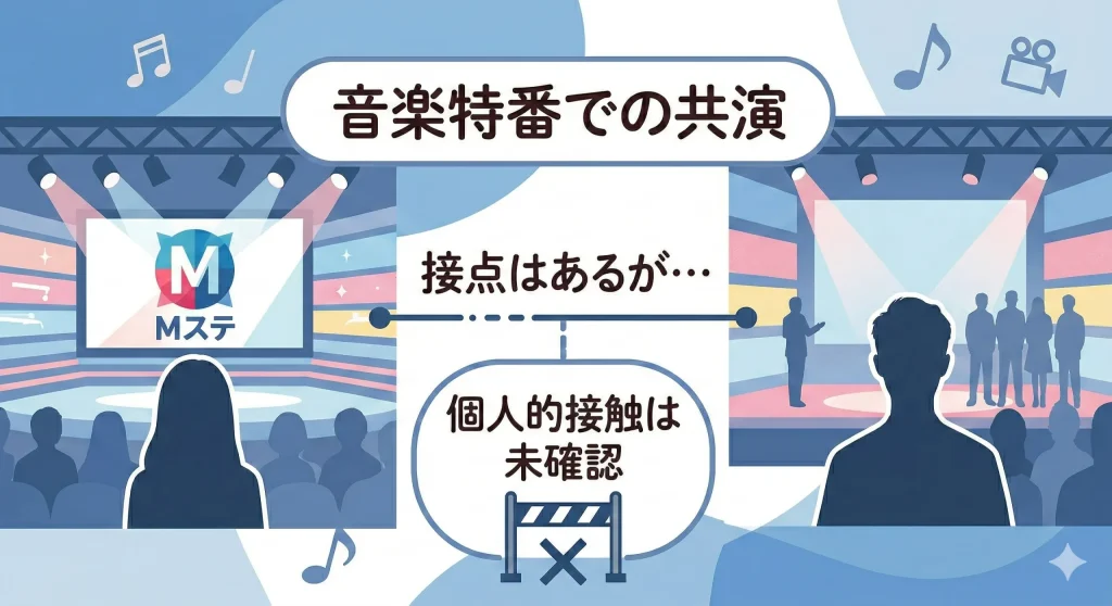 代表的なもので言えば「ミュージックステーション」や「NHK紅白歌合戦」、「CDTV ライブ! ライブ!」といった番組です。こうした番組では、複数のアーティストが同じスタジオ内に滞在したり、ひな壇で近くに座ったりすることがあります。しかし、番組内で二人が親しげに会話をしているシーンが放送されたり、特別な企画でコラボレーションしたりといった事実は確認できていません。テレビ局の楽屋通路やすれ違いざまの挨拶といった「見えない場所での接触」を疑う声もありますが、当時は特にコロナ禍の影響で現場の警備や動線分離が非常に厳格だった時期でもあります。