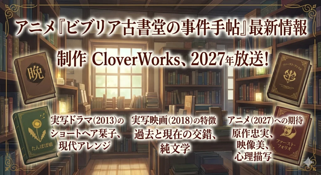 ビブリア古書堂の事件手帖のアニメ化が2027年に実現するという一報は、2026年4月22日に公式から電撃的に発表されました。2011年の第1巻刊行から15年、数々のメディアミックスを経てついに「アニメーション」という形で栞子さんたちに会えるというのは、感慨深いものがありますよね。制作を担当するのは、現代のアニメ業界で圧倒的なクオリティを誇るCloverWorksです。同スタジオは『SPY×FAMILY』や『ぼっち・ざ・ろっく!』といった大ヒット作を手掛けており、静謐な鎌倉の風景や、古書堂特有の重厚な空気感を映像化する上で、これ以上ない最高のアサインだかなと思います。