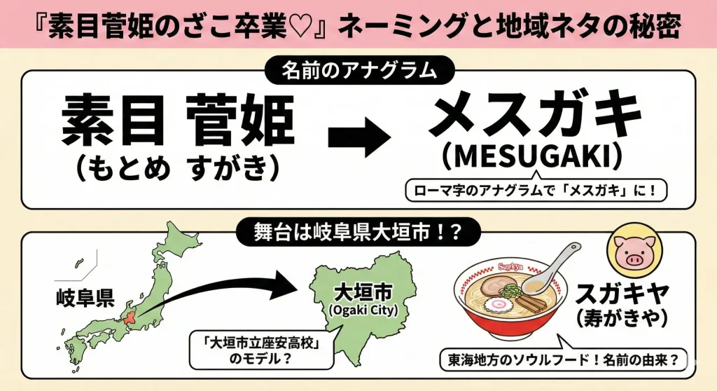 「素目菅姫のざこ卒業♡」を語る上で、読者の間で密かに盛り上がっているのが、その地域的なルーツです。物語の舞台となる「大垣市立 座安高校」。この「大垣」という名前から、岐阜県大垣市がモデルではないかと推測されています。さらに面白いのが、ヒロインの苗字「素目菅(もとめすが)」を略して「すが」+「ひめ」と呼ぶと、東海地方を中心に展開する人気ラーメンチェーン「スガキヤ(寿がきや)」を彷彿とさせますよね。