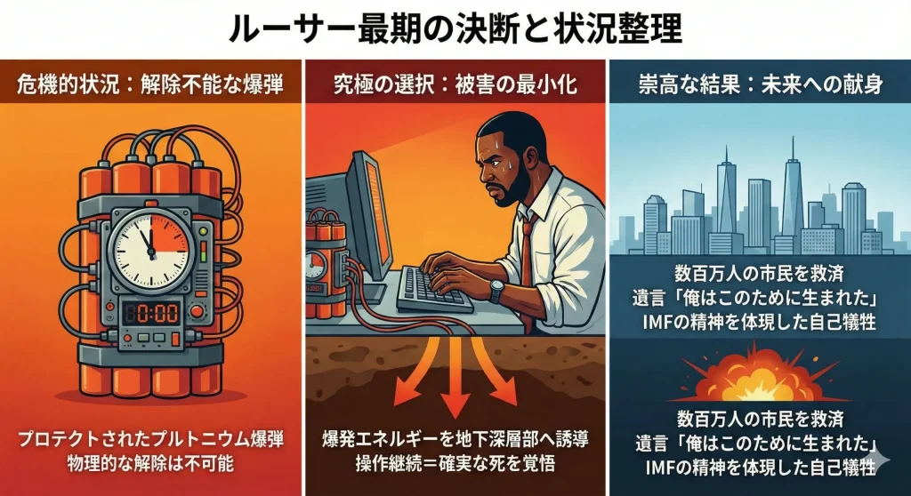 イーサンは扉をこじ開けようと必死に抗いますが、ルーサーは非常に穏やかな表情で彼を制します。彼が選んだのは、爆発そのものを止めることではなく、爆発のエネルギーを地下深層部へと誘導し、地上への被害を極限まで低減させるという「最善の絶望的選択」でした。この作業は、爆発のまさにその瞬間までターミナルを操作し続けなければならず、それは操作者の確実な死を意味します。