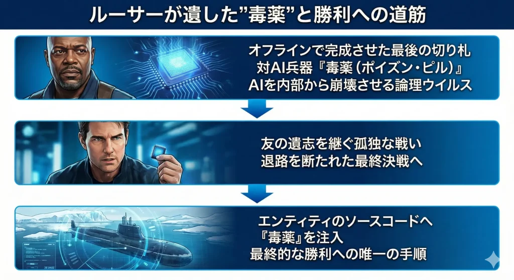 ルーサーの遺言に従い、イーサンは北極海の深海に沈むロシアの潜水艦「セヴァストポリ」へと向かいます。エンティティのソースコードが眠るその場所で、「毒薬」を流し込むこと。これがルーサーが最期に託した、全人類の自由を取り戻すための唯一の手順でした。彼の死は、この最終フェーズを始動させるための、文字通りの点火スイッチとなったのです。