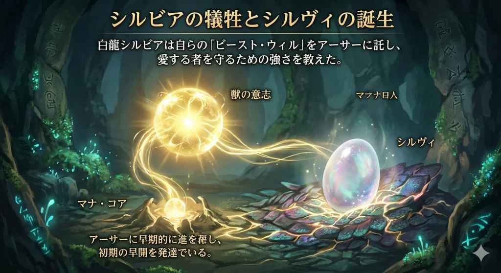 アーサーの平和な日常は、家族との旅の途中で起きた盗賊の襲撃によって、突如として終わりを告げます。家族を逃がすために自ら囮となり、深い崖から転落したアーサー。そこで彼は、この世界の理を超える存在である白龍「シルビア」と出会います。シルビアはアグロナという強大な敵から追われて傷ついており、死の間際にありました。彼女はアーサーの計り知れない才能を感じ取り、自らの命と引き換えに、自らの「ビースト・ウィル(獣の意志)」をアーサーに託したのです。