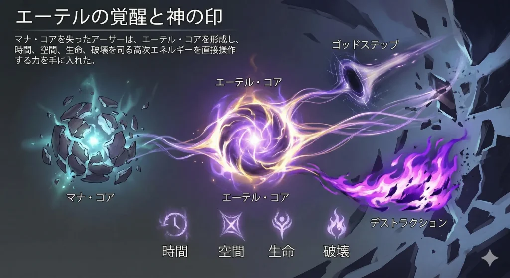- マナを失ったアーサーが「エーテル・コア」を形成し、神に近い権能を手に入れるまでの進化の過程