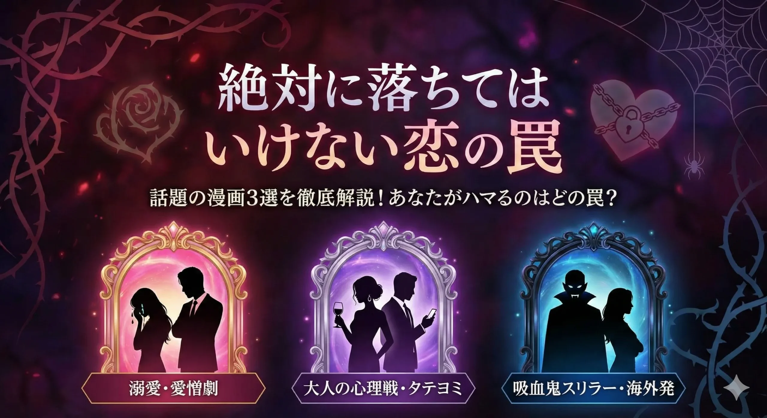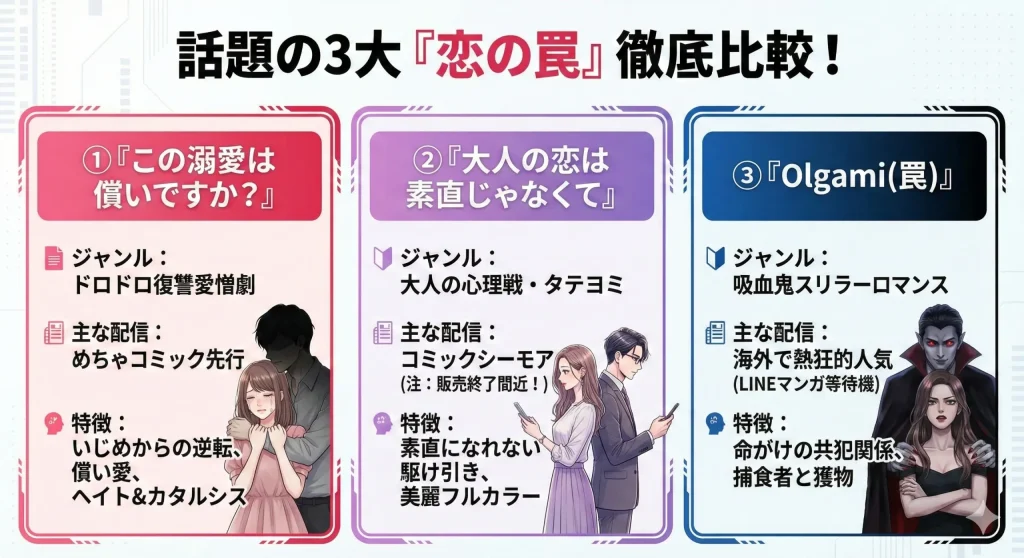 まずは、検索クエリとして非常にボリュームのある「絶対に落ちてはいけない恋の罠」に該当する主要な3作品について詳しく解説していきます。これらはどれも「罠」というキーワードを含んでいますが、ジャンルや読後感が全く異なります。自分が求めているのは、甘い誘惑なのか、ドロドロの愛憎劇なのか、それとも命がけのスリラーなのか。それぞれの正体をここでハッキリさせておきましょう。