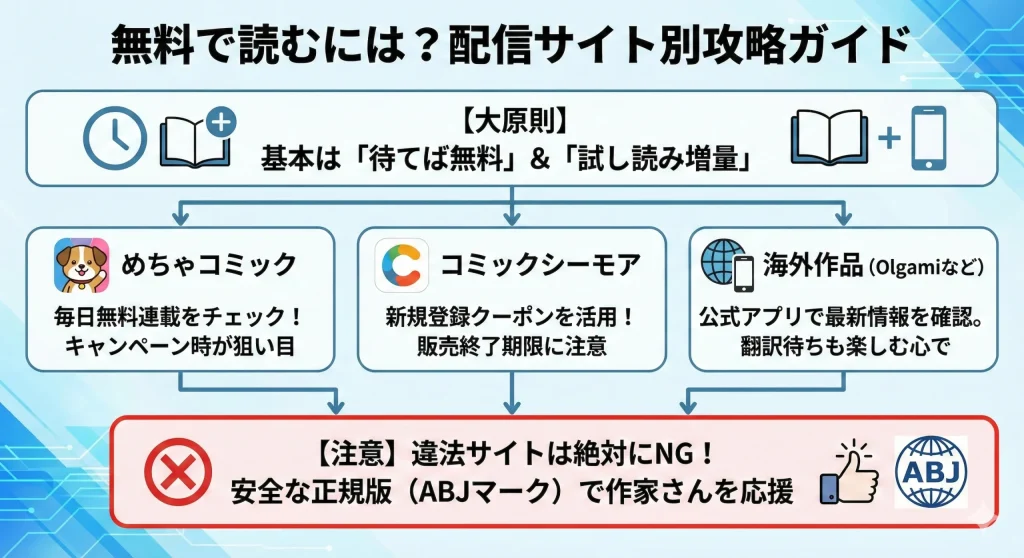 「この作品、どこかで一気に全巻無料で読めないかな?」と思うのは、読者として当然の心理ですよね。私もよく、お得なキャンペーンを探して複数のサイトを回遊したりします。しかし、結論から言うと、今回紹介しているような人気作品を「完全合法的に、今すぐ全巻無料で読む」のは非常に難しいのが現状です。各プラットフォームが「待てば無料」というシステムを採用しているのは、作家さんの権利を守り、継続的な連載を支えるためでもあるからですね。