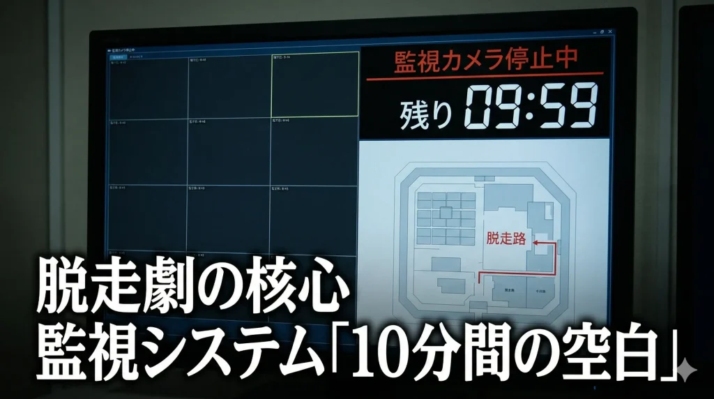 物語が最大の山場を迎えたのが第9話でした。氷川拘置所の女区長として規律を誰よりも重んじていた冬木こずえが、ついに一線を越えて日下怜治を逃がす決断を下したシーンは、私自身、見ていて震えが止まりませんでした。彼女が利用したのは、皮肉にも彼女自身が導入を推進した最新監視システムの更新に伴う、わずか10分間の空白時間です。
