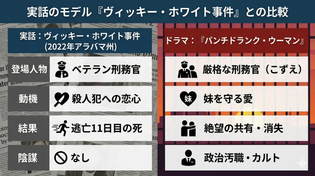 このドラマがこれほどまでにリアリティを持って語られる理由の一つに、モデルとなった実在の事件の存在があります。2022年にアメリカのアラバマ州で発生した「ヴィッキー・ホワイトとケイシー・ホワイトの事件」は、まさに事実は小説よりも奇なりを地で行く内容でした。