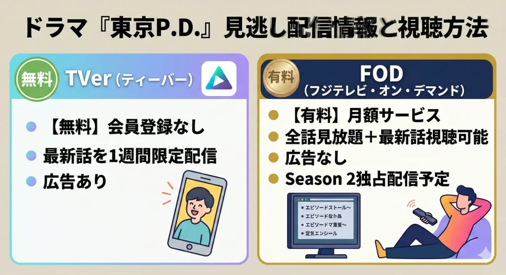 「TVerの期限が切れちゃった」「もこうさんが出るまでの流れも全部把握しておきたい」という熱心な方には、フジテレビ公式の動画配信サービス「FOD(フジテレビ・オン・デマンド)」が最強の味方です。FODなら、『東京P.D. 警視庁広報2係』の第1話から最新話まで、いつでも好きな時に全話視聴することができます。もこうさんが登場する背景にある、広報2係のこれまでの苦闘や、情報のコントロールがいかに難しいかという物語の積み重ねを知ることで、第6話の深みが何倍にも増しますよ。