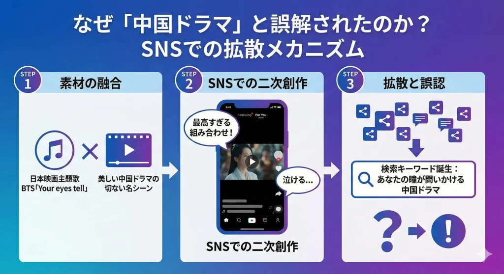 ここまで日本版や韓国版の魅力をお伝えしてきましたが、本題は「なぜ中国ドラマだと思われているのか」という点ですよね。情報の海であるインターネット上では、時として全く別の要素が結びつき、新しい「事実」のように広まってしまうことがあります。このセクションでは、その誤解が生まれたメカニズムを、SNSの文化や中国ドラマ市場の特性から紐解いていきましょう。