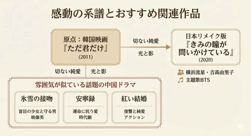 「あなたの瞳が問いかける」の元ネタとなった韓国映画「ただ君だけ」は、驚くべきことに世界5カ国以上で公式リメイクされています。中国ドラマ版を探していた方にとっては意外かもしれませんが、実は中国以外の国々でこの物語は「定番の名作」として定着しているのです。各国が自国の情緒を込めて作り上げたリメイク版のリストをまとめました。それぞれに違った良さがあるので、見比べてみるのも面白いですよ。