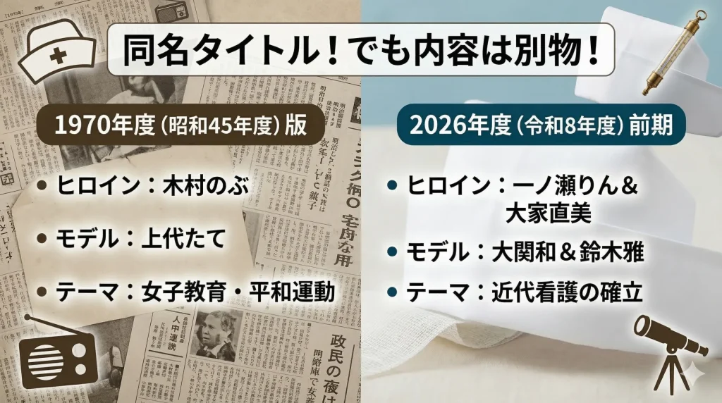 1970年版は一人の女性の半生を追うシングルヒロイン形式でしたが、2026年版は性格の異なる二人の女性が手を取り合うダブルヒロイン形式です。これは、複雑化した現代社会において「一人で戦う」のではなく「仲間と共に乗り越える」というメッセージを強調するための工夫と言えるでしょう。教育も看護も、日本の近代化には欠かせない要素でしたが、そのアプローチの違いを理解することで、より深く今回のドラマを味わうことができるはずです。
