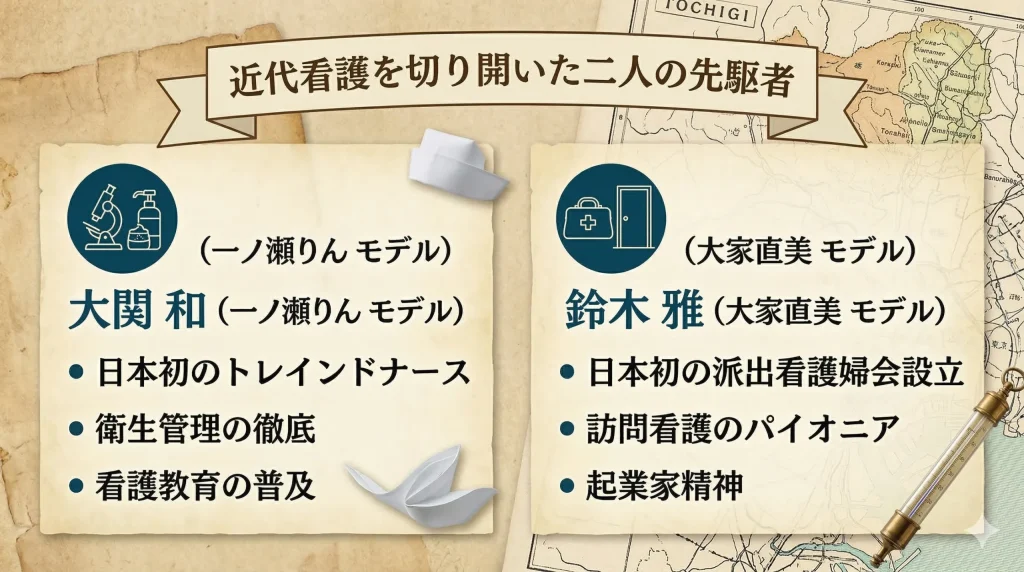 - モデルとなった大関和と鈴木雅の先駆的な生涯と近代看護への貢献