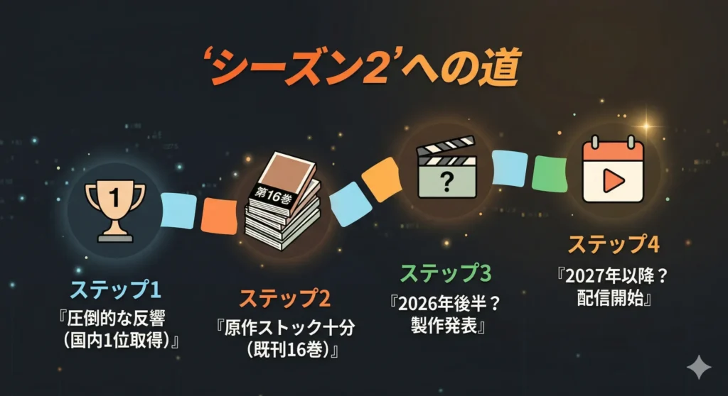 配信直後から凄まじい反響を呼んでいる本作ですが、物語の着地点があまりにも「これからどうなるの?」という終わり方だったので、続報を待つファンの方々の熱量は相当なものですね。ここでは、現時点での公式情報と私の分析に基づいた今後の展望を詳しくお話しします。