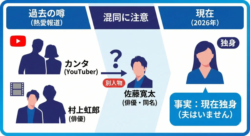 ファンとしては、彼女のような素敵な女性を射止めるのは一体どんな人なのだろうと、ついつい気になってしまいますよね。検索結果を見てみると、現在の婚姻状況はもちろん、以前から噂のある水溜りボンドのカンタさんや、かつて熱愛が報じられた村上虹郎さん、さらにはお名前が似ている佐藤寛太さんとの関係など、実に多くの情報が飛び交っています。一部では妊娠や扶養といった踏み込んだワードまで見受けられますが、実際のところはどうなのでしょうか。
