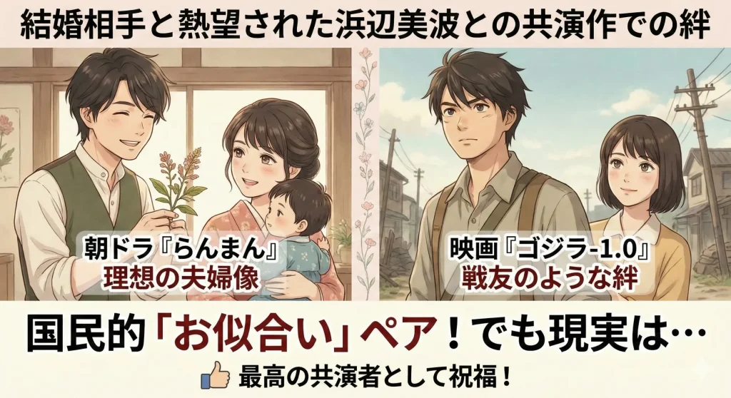 槙野万太郎と寿恵子として、約半年間にわたり激動の時代を共に生き抜く姿を見せてくれた二人。神木さんの天真爛漫な演技と、それを凛として支える浜辺さんの姿は、単なる演技を超えた深い信頼関係を感じさせるものでした。撮影現場でのオフショットや、SNSで見せる仲睦まじいやり取りも拍車をかけ、視聴者の脳内には「神木隆之介の妻=浜辺美波」というイメージが強烈に刷り込まれてしまったのです。さらに、同年の映画『ゴジラ-1.0』でも共演。そこでも戦後の過酷な状況下で寄り添い合う男女を演じ、もはや「この二人はセットで推すべき」という空気が醸成されていました。