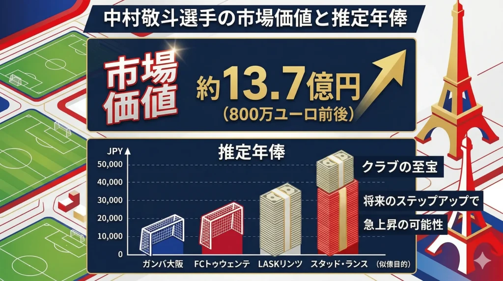 中村選手の現在の推定年俸は、日本円にして約1億7,000万円から2億6,000万円前後と見られています。これはフランスの中堅クラブとしては破格の待遇であり、チームがいかに彼を「手放したくない至宝」として扱っているかが分かります。また、選手の価値を示す「市場価値」は約13.7億円(800万ユーロ前後)とも言われており、彼が移籍する際にはこれ以上の巨額のマネーが動くことになります。