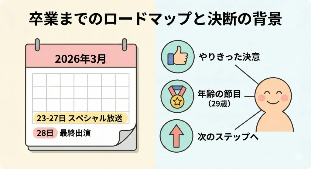 - 最終出演は2026年3月28日、5月にはコンサートでのゲスト出演がある