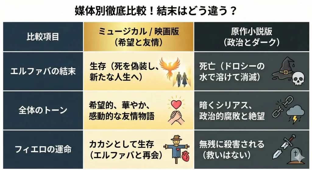 | エルファバの結末 | 死亡(救いがない) | 生存(フィエロと再会) | ミュージカル準拠予定 |