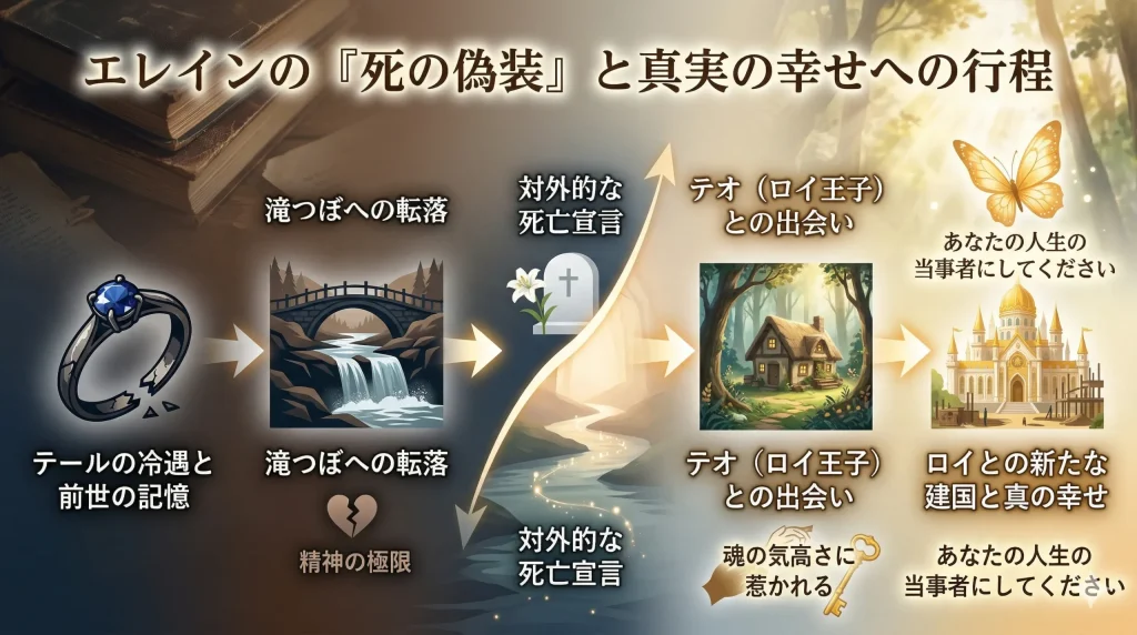 この事件で最も皮肉なのは、テールが彼女を助けようとして投げ込んだ丸太が、あろうことかエレインの頭部を直撃してしまったことです。これにより彼女は意識を失い、激流に飲み込まれてしまいました。対外的にエレインは「死亡」したものとみなされ、葬儀も執り行われます。しかし、実際には彼女は生きており、これまでの人間関係をリセットするための「死の偽装」が結果的に成立してしまったのです。地位も富も捨てた彼女が、ただの一人の人間として歩き出す姿は、読者に強烈な解放感を与えてくれました。