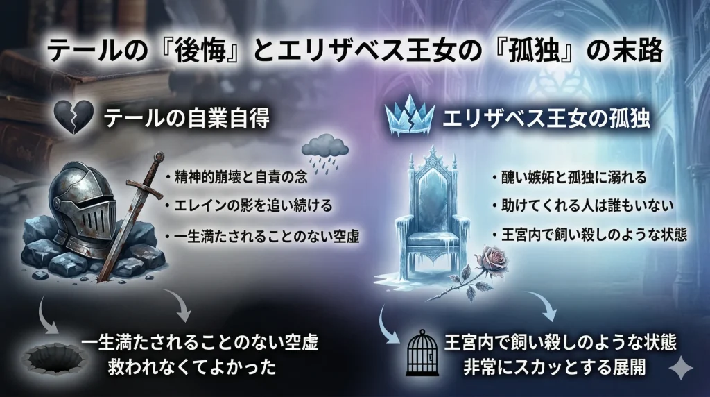 さて、お待ちかねの「ざまぁ」タイムです。まずは元婚約者のテール・トリアム。彼はエレインがいなくなったことで、初めて自分の過ちに気づくという「遅すぎたヒーロー」の末路を辿ります。彼はエリザベス王女を優先することが「騎士としての義務」だと言い訳していましたが、その実は、自分を無条件で愛してくれるエレインの献身に甘えていただけでした。