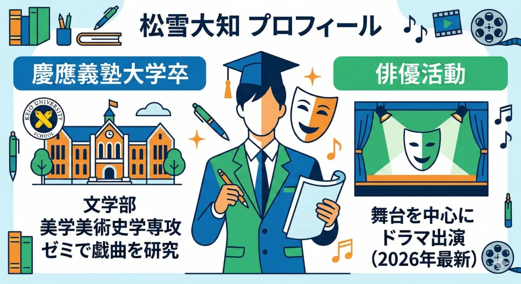 松雪大知さんの大きな武器の一つは、その高い知性です。彼は難関校として知られる慶應義塾大学文学部を卒業しており、在学中は美学美術史学を専攻していました。単に芸能活動の傍ら大学に通っていたわけではなく、学問として「表現」の本質を追求していた点が非常に興味深いですね。彼が選んだ専攻は、芸術の本質を哲学的に考察する分野であり、俳優という「自分を表現する職業」に直結する学びだったと言えるでしょう。