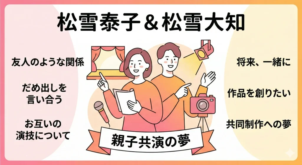 『徹子の部屋』の後半で、松雪泰子さんは将来の展望について非常にワクワクするような話をされていました。それは、いつか息子である大知さんと一緒に作品を創りたいという夢です。単にドラマで共演して「親子役を演じる」といった表面的なことだけではなく、企画や演出、あるいは制作の段階から協力し合えるような、深い形でのクリエイティブな共同作業を望んでいるようです。