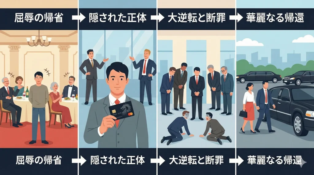 辰年故郷への華麗なる帰還のネタバレ結末の核心は、まさに「完全懲悪」の極致です。最終盤、一族がひれ伏すような地元の名士や、国レベルの権力者たちが続々と祝宴の会場に到着します。親族たちは自分たちが呼び寄せた「ライバル君のコネ」だと信じて疑いませんが、到着した権力者たちが跪いた相手は、なんと一番末席で妻に料理を分けていた主人公でした。「会長、お迎えに上がりました!」という怒号のような挨拶とともに、会場の時間は凍りつきます。