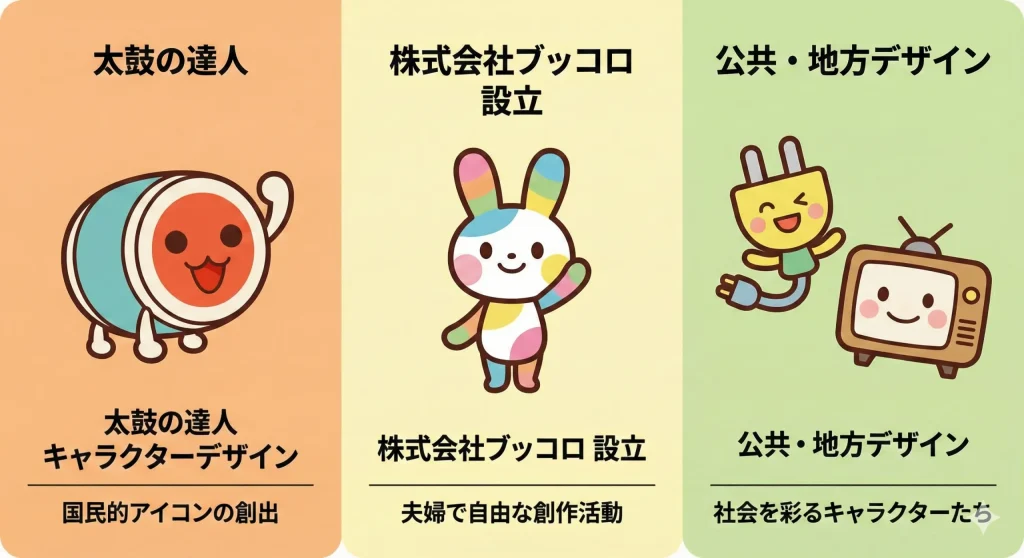 2015年4月、二人は大きな決断をします。それが「株式会社ブッコロ(BUKKORO)」の設立です。ヨコオタロウさんが代表取締役を務め、有希子さんも中核メンバーとして参加するこの会社は、特定の巨大企業に所属しない「自由なクリエイティブ集団」としての拠点となりました。社名の由来は、有希子さんがデザインした「ブッコロ」というキャラクターにちなんでいるのですが、このネーミングセンスからしてお二人の遊び心が満載ですよね。